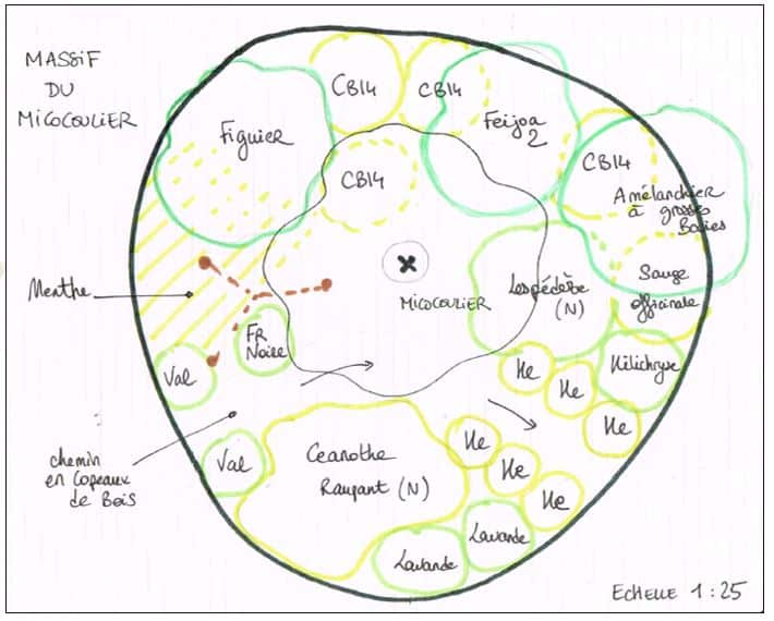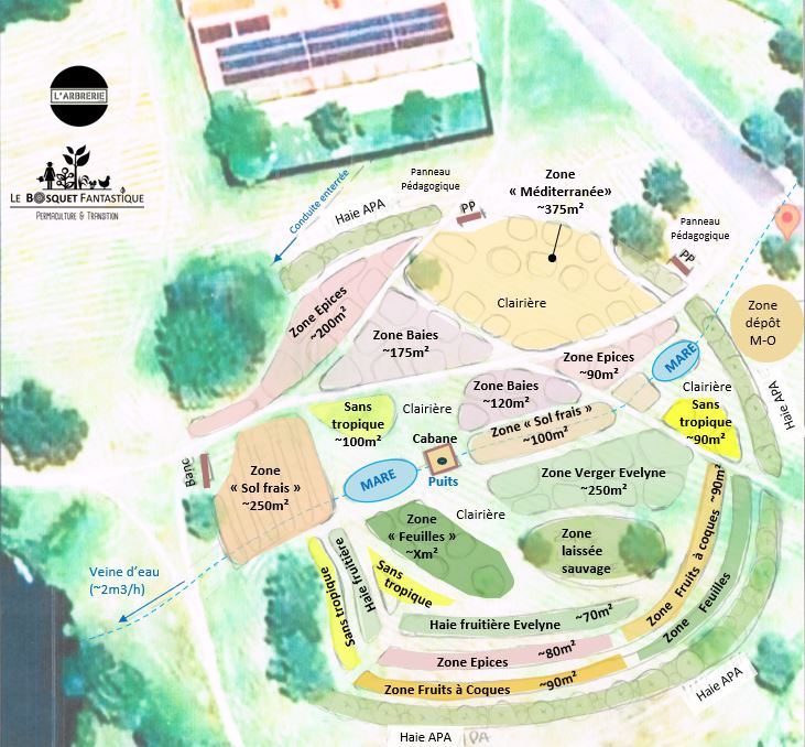 Sur ce projet, démarré en Août 2025, nous réalisons (en duo avec Alexis de la ferme du Martel), sur un terrain de 4000m² mis à disposition par la mairie, le design de la forêt (voir plan d’ensemble ci dessous), l’achat des plantes auprès d’une dizaine de pépinières locales, la préparation du terrain (préparation du sol, pose de clôtures, arrosage, entretien..) et bien sur les plantations citoyennes avec les habitants et les 2 écoles élémentaires du Trépadé et de la Béouzo.